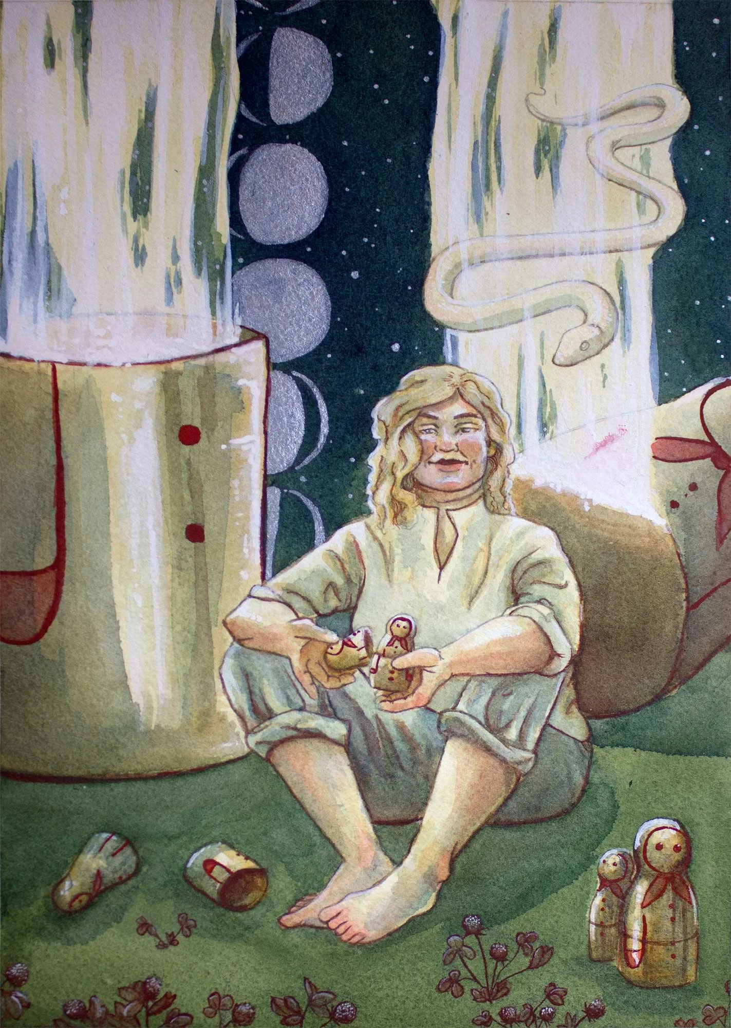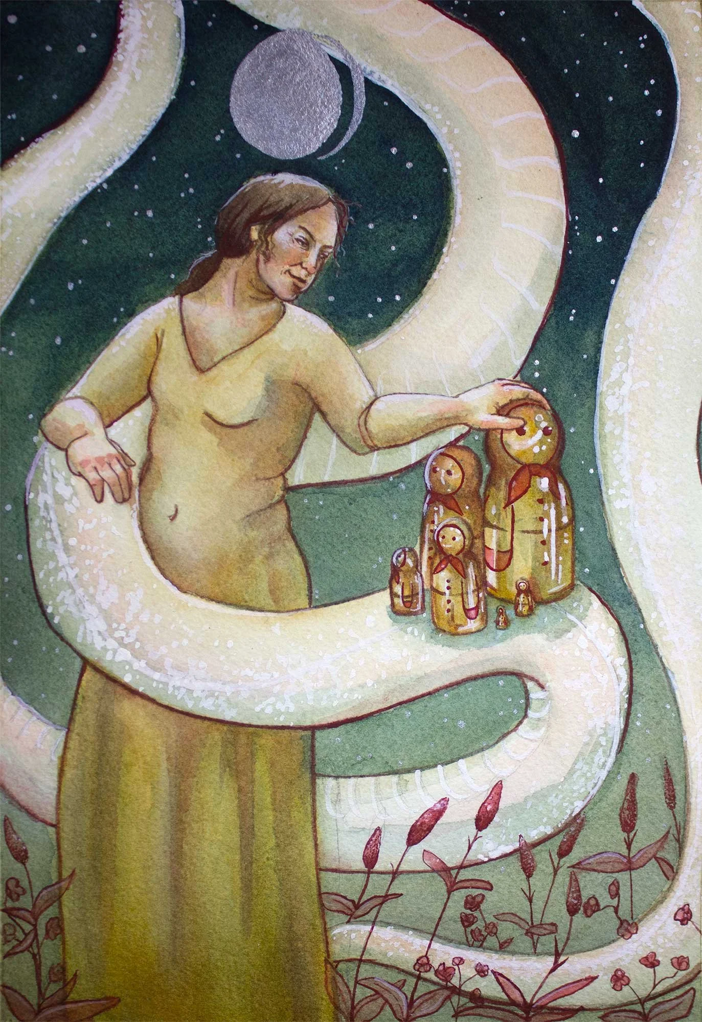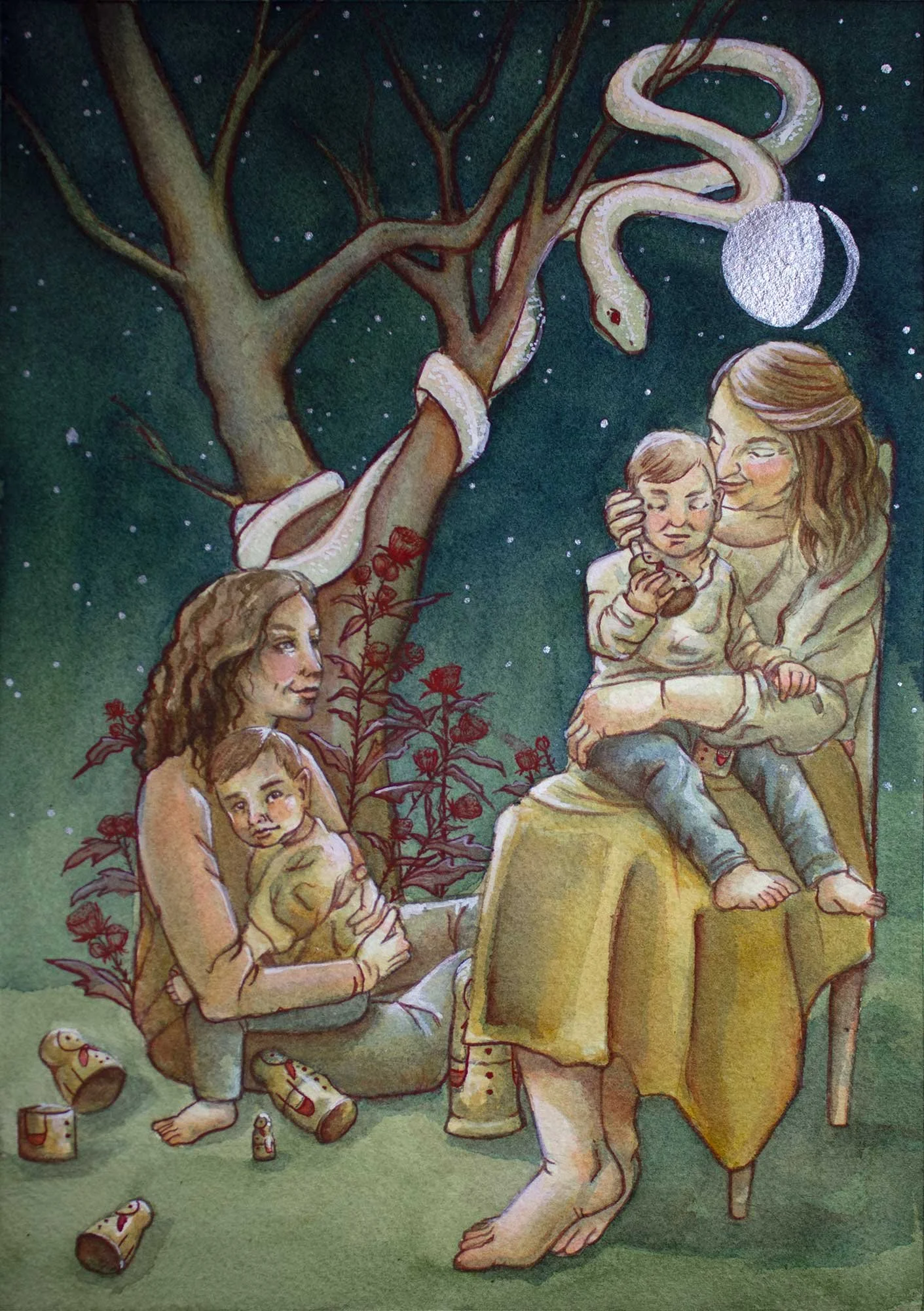 Surrounded by symbols of the divine feminine, including the waning crescent moon and serpents, these women are guided through their journey with ease. They take inspiration from the moon, embracing the natural shifts and phases of life. The matryoshka dolls reflect the wisdom of past generations who have navigated this stage of life, while also looking forward to sharing their knowledge with future generations. This wisdom is further embodied by the herbs depicted around them—plants known for their role in managing and alleviating menopausal symptoms. “Phase Shift” celebrates the beauty and resilience of menopausal women, honoring their experiences with acceptance and reverence for life’s natural transitions.